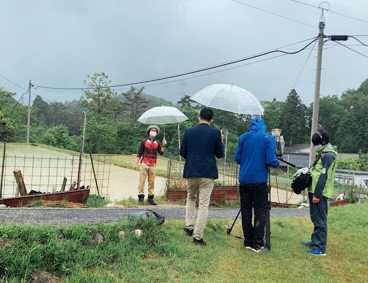 朝からシトシトと降り続く小雨の中 まずは田んぼをバックにインタビュー。