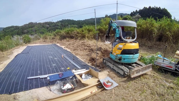 ここに格納庫を建てる予定で、その支柱を50センチピッチで、深さ45センチの穴を約50個開けるミッションに、2人でチャレンジ!