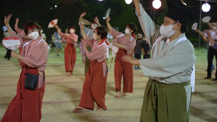 7月から毎週土曜日に踊りの練習会があり、そこで地域のレジェンドから踊りを教わり、当日は装束を付けての参加です。