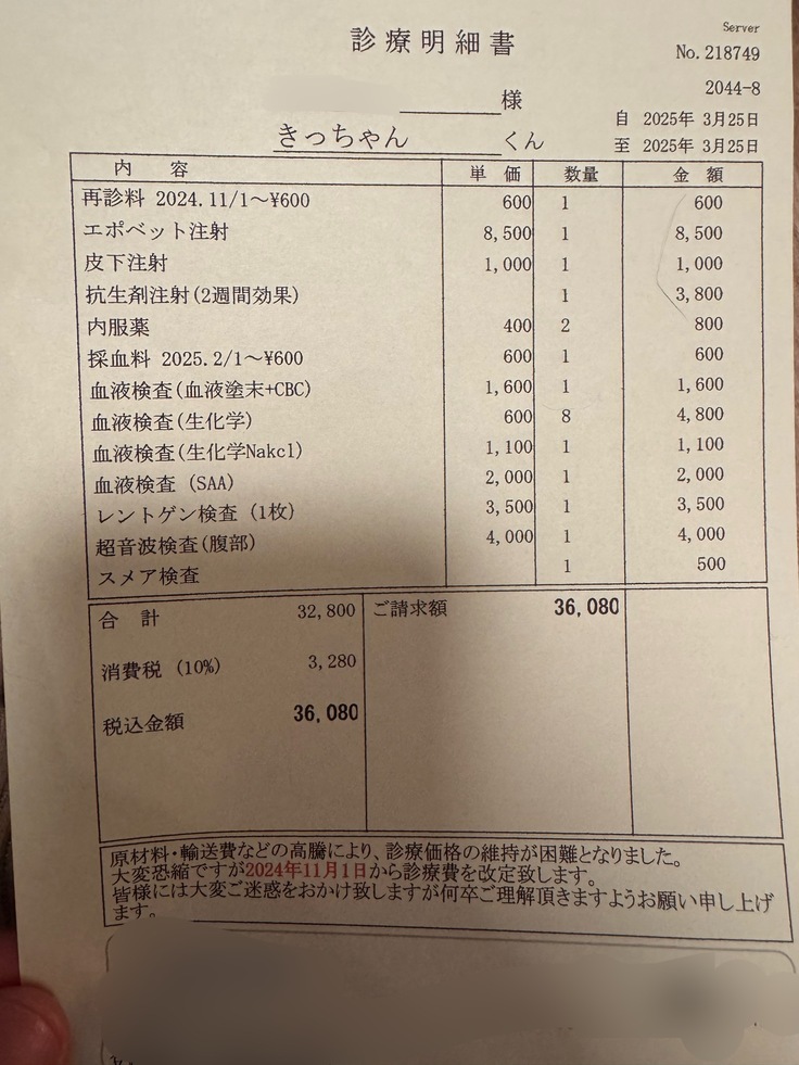 そして今日、最後に渡された明細を見た瞬間…血液検査、エコー検査ととりあえずの注射だったのですが、思わず息をのむほど金額でした。