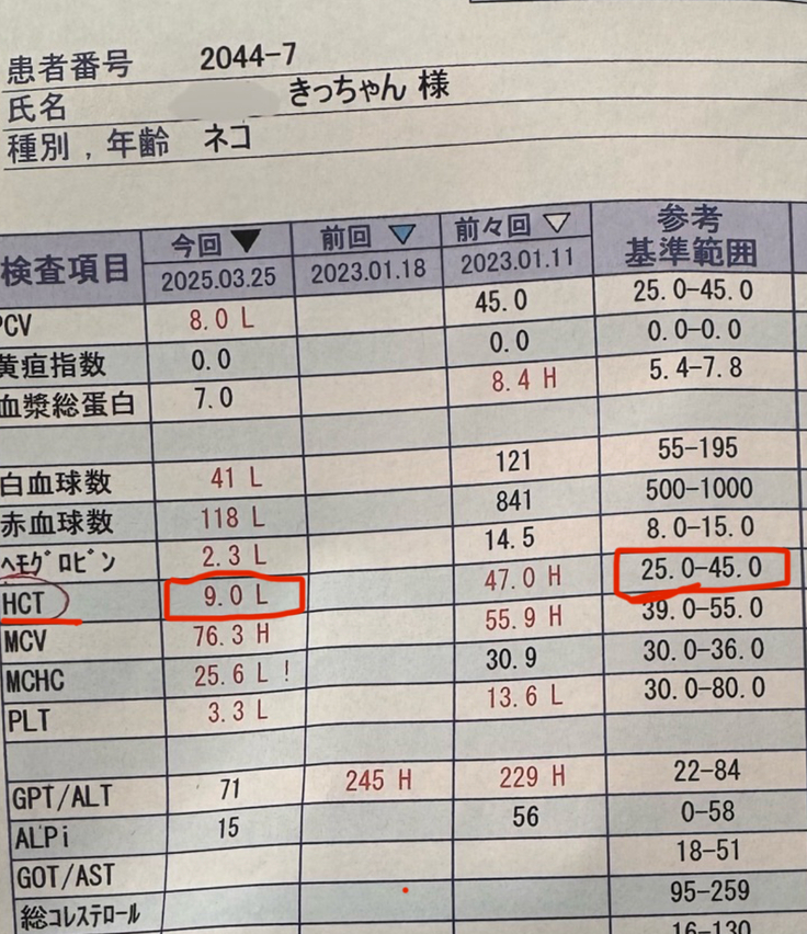 身体を触って見てもらった時に「少し黄疸が出てそうですね、、熱もありそう、、」と言われて血液検査をしていただいた結果、極度の貧血、白血球の数値の上昇で正直いつどうなってもおかしくない状況と言われました。【HTC ヘマトクリット(貧血)が9というのが危ないぐらいの貧血だそうです。他にも赤いのは良くないそうです】