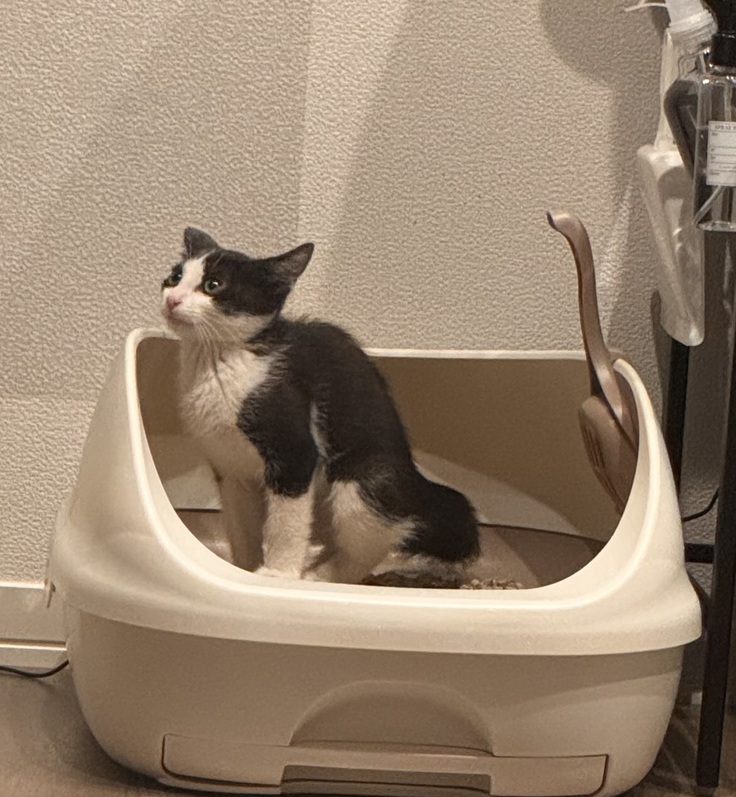 子猫用のトイレを急いで用意したのですが、少し目を離している隙に一丁前に大人用のトイレでしていました。笑う