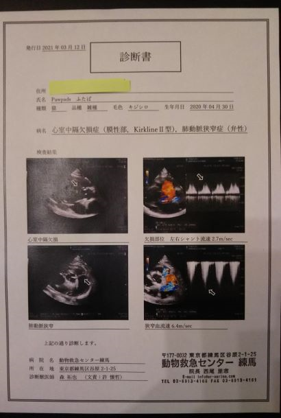 今年2月末と3月初、循環器専門の獣医師に詳しい検査を行って頂きましたところ、心室中隔欠損(重度)、肺動脈弁狭窄(重度)の診断がくだされました。
