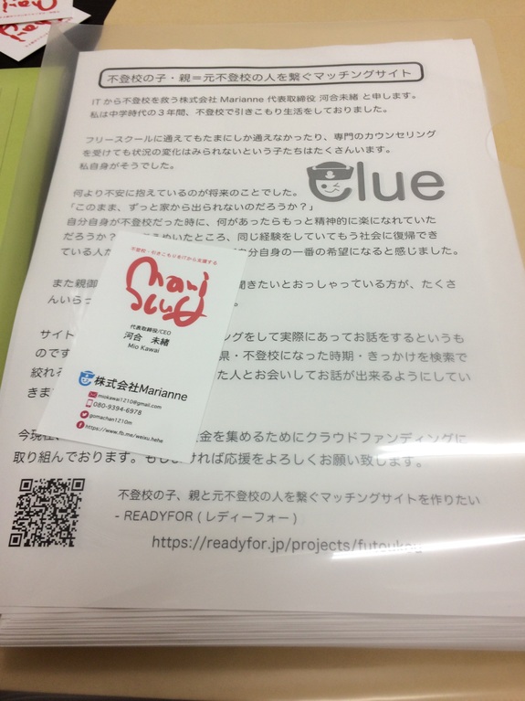 親御さんはそれぞれご自身のお子様と境遇が似ている元不登校生とお話をされたがっていました。改めてclueのサイトの必要性を感じました。