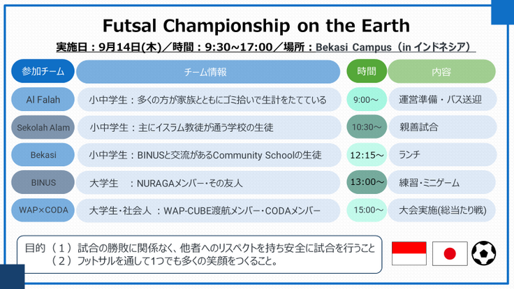 昨年の12月、WAP創立10周年記念式典があり、当時の同期や後輩と思い出を語り合う機会がありました。そこで、現役大学生の活動の話を聞きながら「社会人になった自分たちにも何かチャレンジできることはないか」と考えるようになりました。そして、インドネシアのこの観戦問題を同期や後輩に話し、このプロジェクトの企画が発足しました。今まで私たちが開催してきたフットサル大会の経験値とノウハウを活かしながら、子どもたちへ明るい未来の道標を示すことができる・・・、そう感じながら、わたしたちは定期的に集まり、具体的な企画の内容や想いを話し始めました。