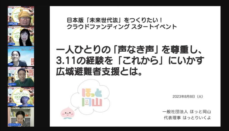 冒頭にたっぷり時間をとり、未来世代法の概要、世界での未来世代法、そして今回のクラウドファンディングのプロジェクトページを共有しながら、詳細を説明させていただきました。