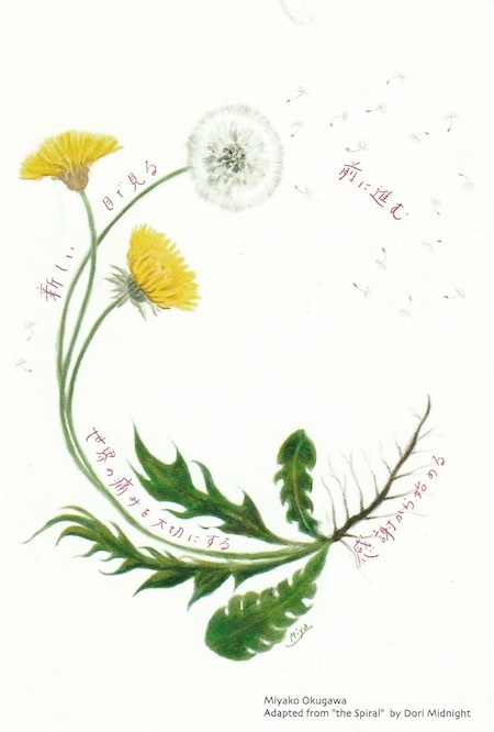 「個人と社会の変容を促すための画期的なフレームワーク」です。システム理論、ディープ・エコロジー、太古の教えの教えがその土台にあります。「感謝から始める」「世界の痛みを大切にする」「新しい目で見る」「前へ進む」の4つのステージが螺旋状に巡るように構成されており、それぞれのステージに、沢山のプログラムが用意されています。