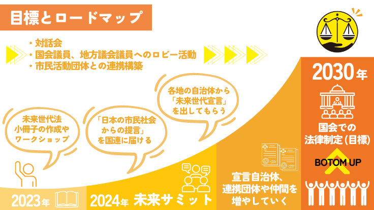 その中で私たちが未来世代法の中に込めたいものを、未来世代宣言にまとめ、各自治体に提案させていただき、宣言を出していただく。