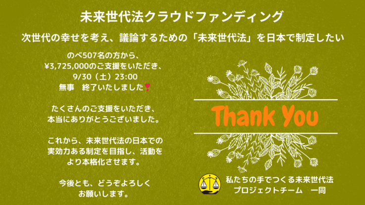 未来世代法クラウドファンディング❣️無事達成し終了しました。たくさんのご支援をありがとうございました
