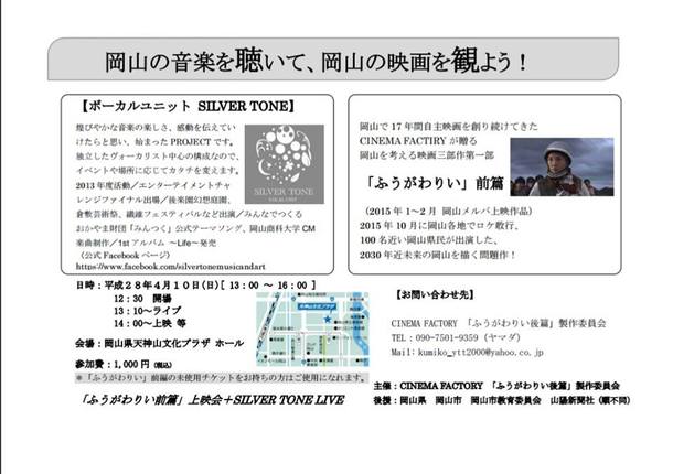 来る4月10日13時から天神山文化プラザ(岡山県岡山市 北区天神町8−54)で、「ふうがわりい前編」上映会&岡山のボーカルユニットSILVERTONEによるライヴを開催されます(*^^*)前回見逃された方も、初見の方も、ご家族ご友人をお誘いあわせの上、是非ご来場ください。お待ちしております。