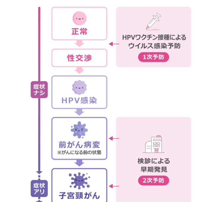 まず「1次予防」としてHPV感染を防ぐためのワクチン接種があり、「2次予防」としてがんになる前の段階やがんの初期に発見するための定期的な検診があります。