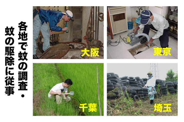 保育園、個人の民家、大使館、飲食店、ビル、音楽スタジオ、発電所、廃タイヤ置き場、マンション、墓地、病院など様々な場所で、蚊、ユスリカ、ゴキブリ等の調査や駆除を行ってきました。スタジオで蚊駆除に伺った数年後に、ラジオ番組で蚊を取り上げられ、出演する専門家にあたってみると、以前その場所を駆除した私だった、という偶然の話もあって、ラジオ放送で話していただいたこともありました。