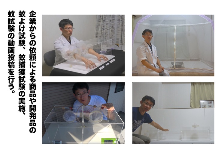 蚊対策商品の開発のために、蚊に対して実際に効果があるかどうかの試験、問合せがあった際のバックデータ(自社調べではなく、第三者機関によるデータ)としての試験データ獲得、効果を見込める材料のスクリーニング、国内販売前に輸入品の日本での効果確認、商品比較のための雑誌記事作成などの目的で、化粧品、自動車用品、電気製品、電子部品、化学、日用品、衣服、子供用品、玩具、音楽、ホームセンター、雑誌、網加工、接着剤、テープ製造、など幅広い業界から依頼され、蚊を使った試験を実施してきた実績があります。