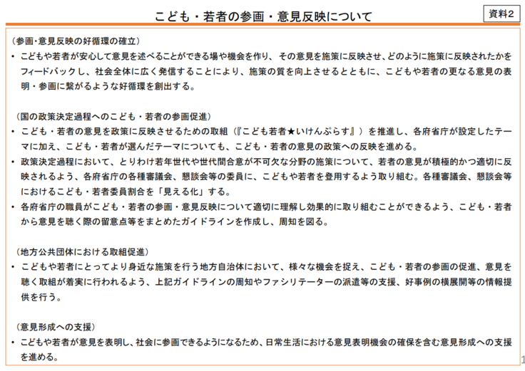 こども家庭庁のホームページに本日(10日)開催の「こども家庭審議会基本政策部会(第6回)」の資料がアップされていました。こども・若者の意見を施策に反映させる方針が示されています。当事者の声を聴くのは大切なことだと思います。ただ、こども・若者に限らず大人の場合にもあてはまりますが、理路整然と考えを述べる人の意見ばかりが取り上げられて、うまく言葉にできないけれど、とっても大切なことを言おうとしている人の声はなかなか掬い取ってくれないようです。