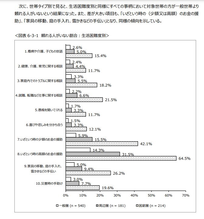 少し前になりますが、このグラフは石巻市の一般家庭と生活困窮家庭の比較になります。生活困難家庭の親は、不安を抱え、身体の不調を抱え、不登校は多く、何もかもうまくいかないことが多いのです。https://www.city.ishinomaki.lg.jp/cont/10405000/07seikatujittai_hogosyajyokyo.pdf