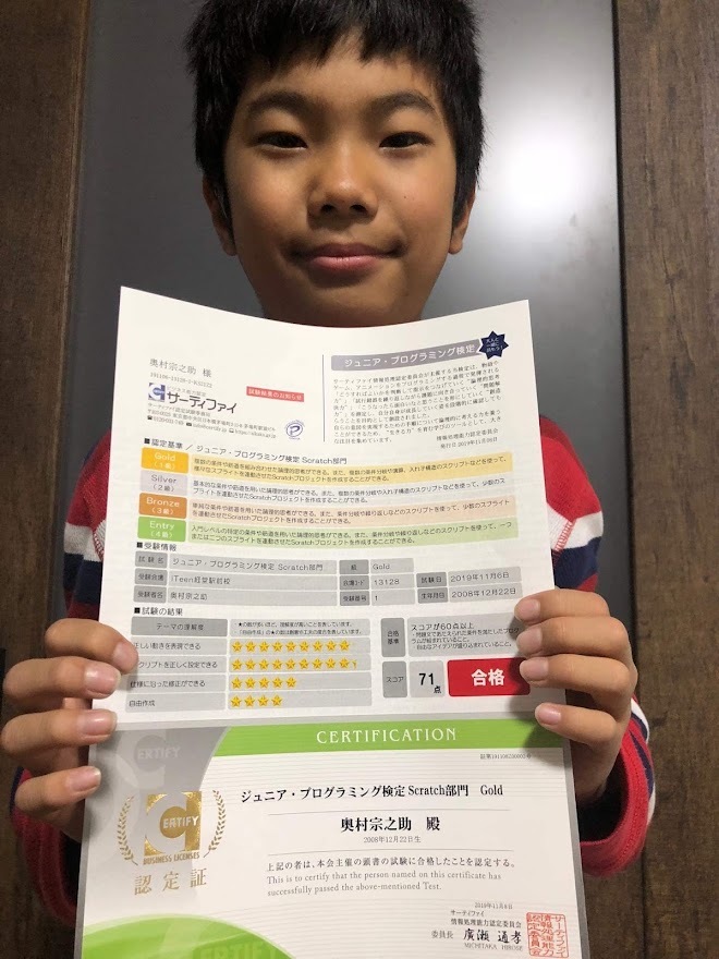 このマサチューセッツ工科大学が作ったプログラミングアプリのScratch(スクラッチ)検定Gold一級を2019年11月に合格しました。今は、プログラミング言語C#使いUnityソフトでVRのゲーム開発をしています。
