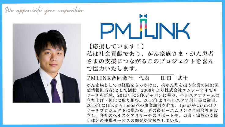 ①アンケート調査はPMLINK LLC様の協力のもと、「がん家族」の方にアンケート調査を実施いたします。