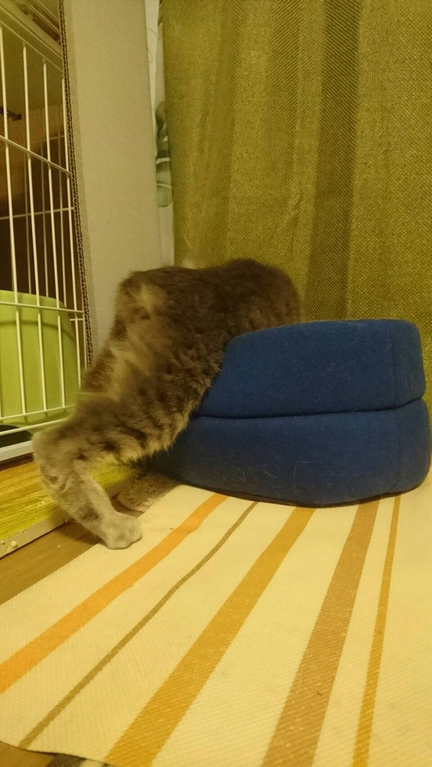 最近、ケージからお部屋に出している間は、このねこべっどが花丸のお気に入りの場所です。以前は乗り降りができないので保護者が乗せてあげていたのですが、最近では花丸自身がこんな感じで自由に乗ったり降りたりしているようです