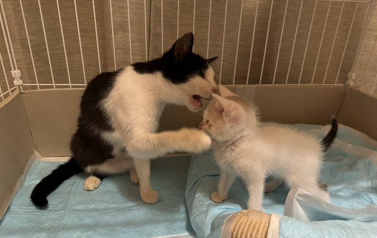 ほとんど1日中寝ていたシンバが、アテネに甘噛みを教えてもらったり、アテネがユラユラ動かす尻尾を追いかけたり、よく遊ぶようになりました。