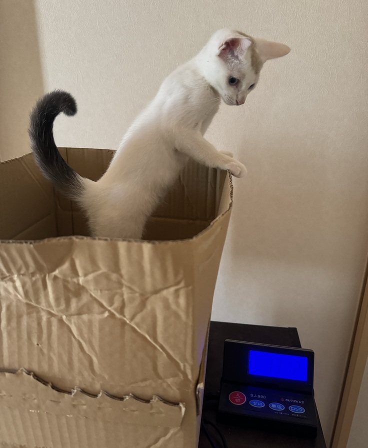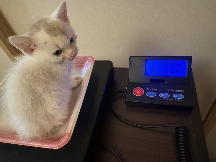 シンバとの日々の暮らしで欠かさずしていることは、毎朝体重を計ることです。1g の体重増加も嬉しくなります!