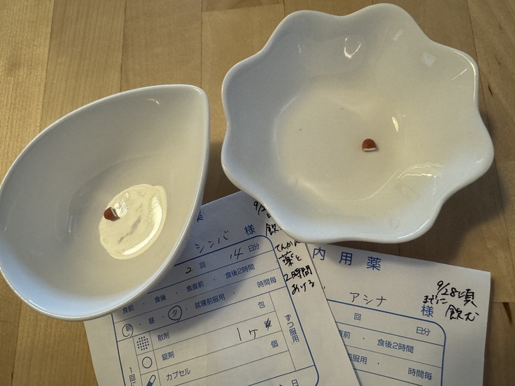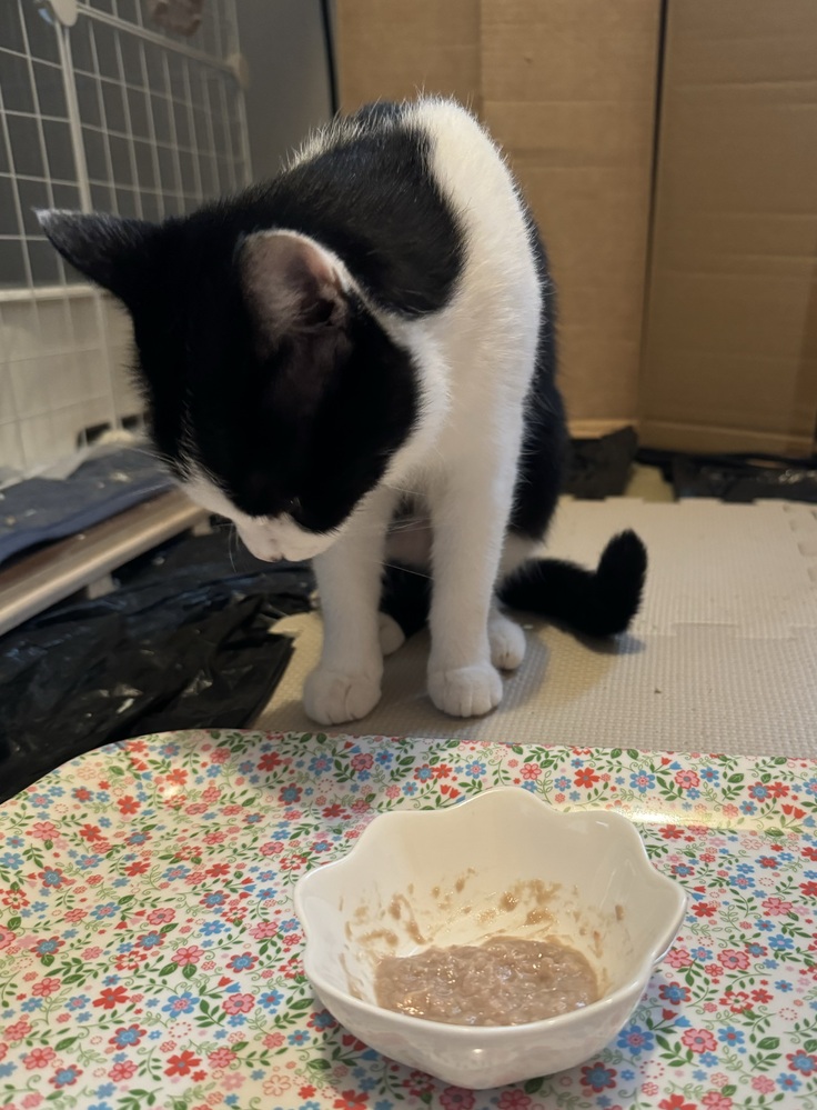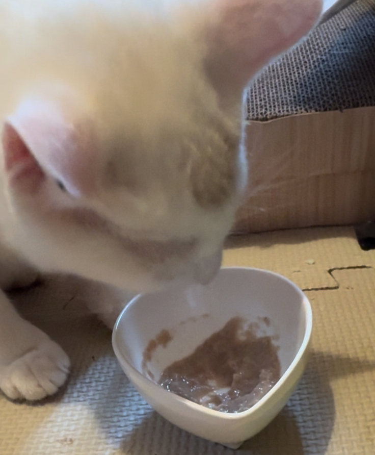 小さいスプーンに薬入りのウェットフードを少し乗せ、その上に薬なしのウェットフードを重ねて、少しずつ食べさせていきました。完食まで時間がかかりましたが、アテネも頑張って完食してくれました!