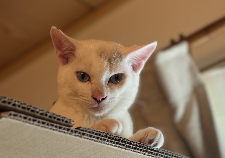 すると、どうでしょう!今日は、アテネがベッドを離れてトイレに行った少しの間に、シンバが走ってベッドに駆け寄り、横になったのです。少し横になって私の顔を見上げ、『こんなもんか…』という表情を浮かべて、またすぐにいつものお気に入りの場所に戻っていきました。