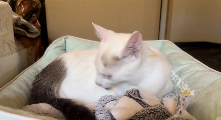アテネがご飯を食べている間に、シンバはさっさと自分のご飯を済ませて、アテネのベッドでくつろぐのが習慣になってきました。毛繕いをしてくつろぎながら、鼻を毛布にクンクンと近づける姿が可愛いです。