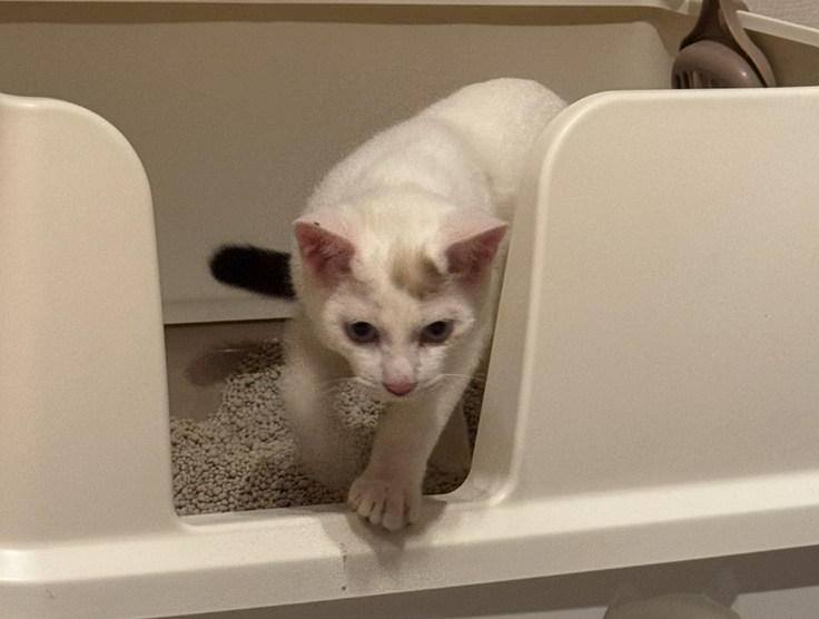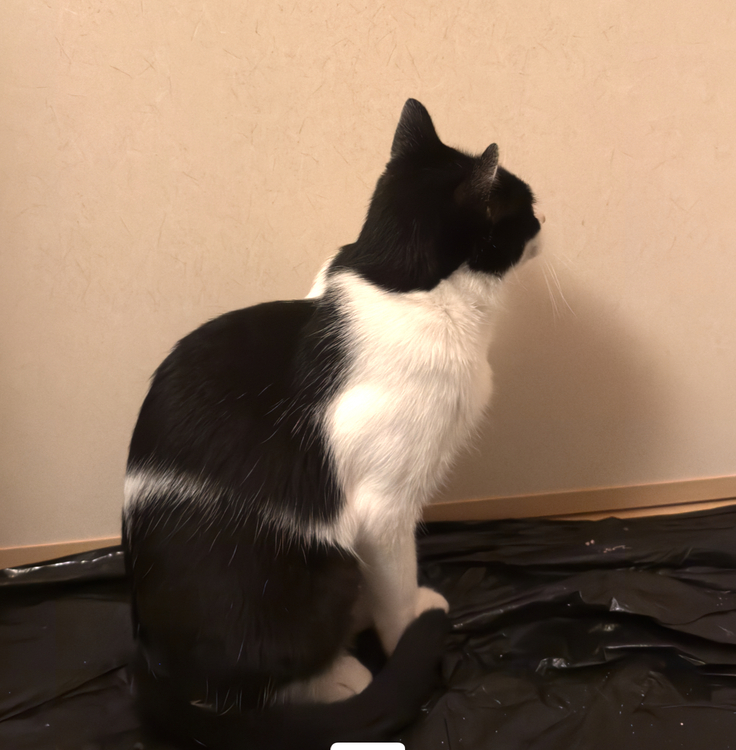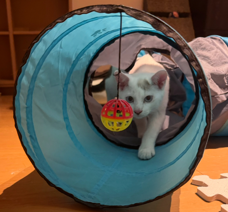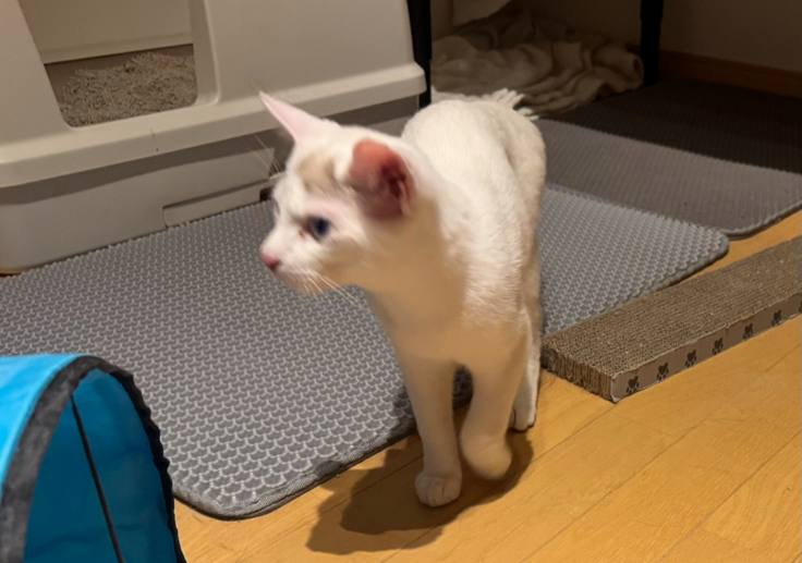 先住猫のトイレの匂いを入り口で嗅いでいるだけでしたが、そのうちにトイレにも入り、さらにおもちゃに興味を持ち始めました!トンネルをくぐったり、ボールで遊んだり、キャットタワーでくつろいだりと、すぐに慣れてきたようで、尻尾をピンと立てて自信を示していました。窓のパトロールもしていました。パトルール姿は、自分の部屋でいつもしている時の表情と一緒でした。