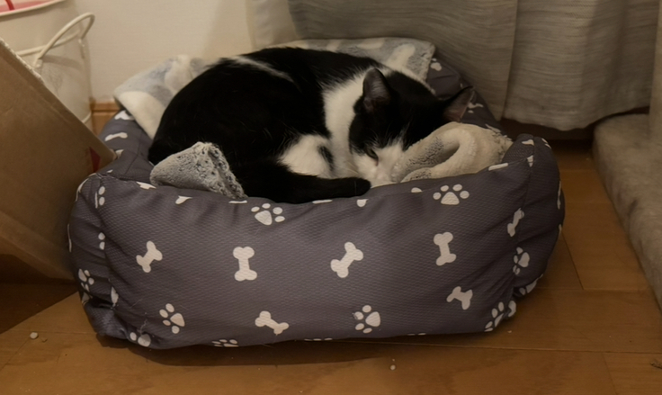 アテネはそのすべてのベッドを試しながら、その時の気分で使う場所を選んでいるようです。先住猫の匂いは特に気にならない様子です。