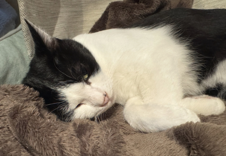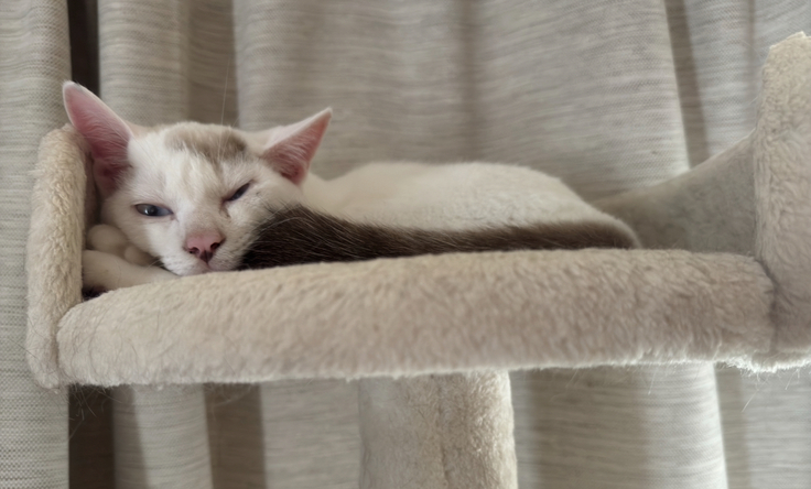 今日はアテネがベッドでリラックスする様子を見たシンバ、お気に入りのキャットタワーに登ったかと思うと、ウトウトし始めました!