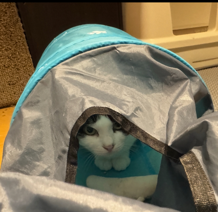 シンバも次男猫の前で大好きなオモチャで遊びながら、まるで「一緒に遊ぼう!」と誘っているようでした。次男猫もシンバが遊び終えたオモチャで「これ、こうやって遊ぶんだ!見てな!」と言わんばかりに遊び始めました。そして、眠くなったシンバはキャットタワーの定位置からあくびをしながら、次男猫が遊ぶ姿を見ていました。アテネも次男猫をトンネル遊びに誘っていました!