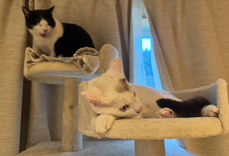 今日はシンバはお留守番でした。きっとアテネが帰るまでソワソワしていたのでしょう。帰宅してアテネをケージから出したら、シンバがキャットタワーの中段からすぐに駆け寄ってきて、「ママを出して!」とでも言うように私の顔を見上げました。アテネも「ただいま」と言うように鳴き始め、ふたりの再会がほほえましかったです。ふたりとも安心したのか、一気にキャットタワーへ上がり、寝る準備をし始めました。