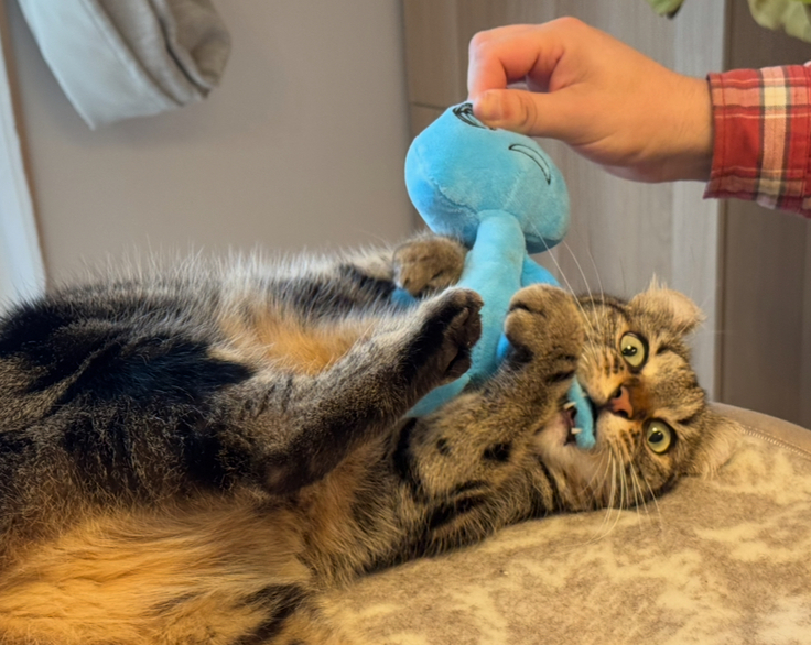 アテネの早食いペースは相変わらずですが、好きな場所で寝て、好きなおもちゃで遊び、元気に暮らしています。