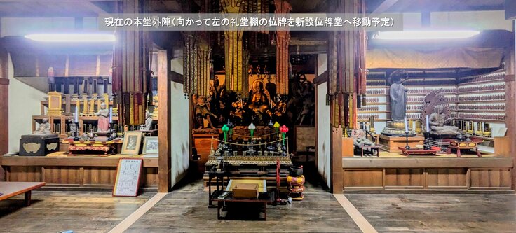 本堂納戸を位牌堂へ改修、現在礼堂にある位牌を移して八雷神面安置場所の準備工事実施、本堂正面扉の改修工事(アラームシステム強化)、内陣・外陣の照明設置、オートロック導入、不足している法要用荘厳品、備品 など