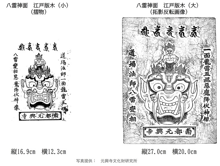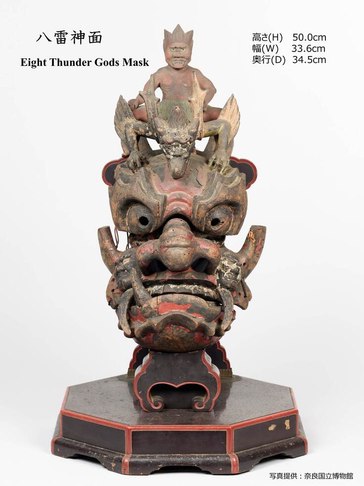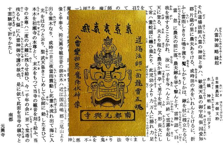 9世紀に薬師寺の僧、景戒が記した仏教説話『日本霊異記』には、雷の申し子である道場法師(どうじょうほっし)が元興寺で鬼を退治する話が登場します。尾張の国で雷神を助けた夫婦が授かった子供は、怪力の持ち主で、力士となり様々な活躍をします。そして成人して元興寺にて出家し、道場法師となります。元興寺で夜な夜な現れ悪さをする鬼を退治すべく闘うのですが、その際法師が八雷神の鬼神の形相となったと言われ、この形相を表す面が信仰の対象となりました。江戸時代には、観音堂などの修復のためにしばしば開帳され、その霊験を広めるために『八雷神面略縁起』が作られました。この神面を拝すれば「疫病疫難を払い、雷火の難を遁れ、生霊・死霊・不正の邪鬼を除く」とのご利益が説かれて版木が作られ、護符が刷られていました。その後、19世紀には雨乞いのために開帳されるようになり、県内の農村から貸し出しを希望する声もあったと伝えられています。また、奈良奉行であった川路聖謨が訪問した際には、厨子に収められていたことが記録されています。八雷神面は、室町時代後期から江戸時代前期にかけて作られたとされ、作者は不詳です。 八体の雷神は、八雷神そのものに加え、頭上の小鬼、龍、頬の二魂(顔)、さらに面の上部を外した際に現れる三魂(顔)を含め、合計八つの顔で表現されていると考えられます。