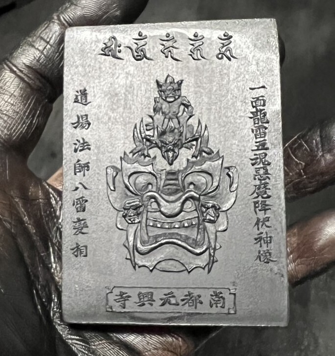 昭和初期、幕末の大火以降荒れていた寺を復興した、水野圭真和尚は八雷神面厄除信仰を復活すべく、江戸時代に使われていた版木(小)で護符授与を再開しました。その護符意匠をもとに お財布に入るサイズのお守りカードを現在拝観実施時に授与しています。