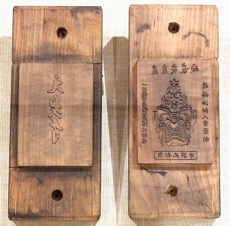当寺に現存している八雷神面護符の版木は 江戸時代のものが大小2枚(異なるデザイン)あります。おそらく、水野圭真和尚入定後の当寺では、これまでこれらの版木を実際に手刷りした護符を授与してきたことはなかったのではないかと思われます。