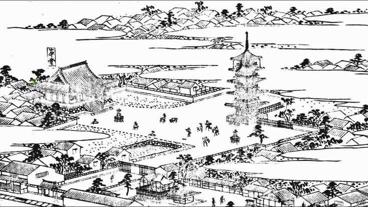 当寺の境内は、下図の大和名所図会に掲載されていたころからほとんど形は変わっておりませんが、現在は四方をほぼ住宅に囲まれ、ならまちの往来が多い表通りからはわかりにくい場所にございます。