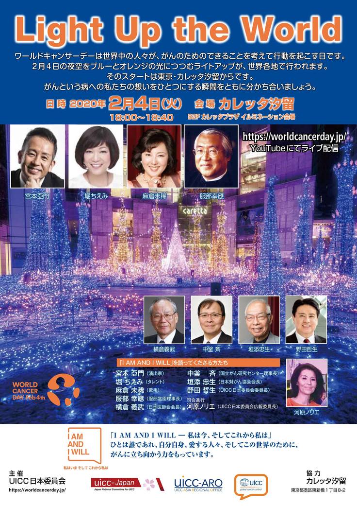UICC日本委員会では、この日にがん啓発のためのイベントをカレッタ汐留で行います。ライトアップの点灯式をはじめ、国内の著名人やがん医療の権威が参加するトークセッションも開催されます。開かれたイベントですので、ぜひ皆様、お誘いあわせの上、お越しください。