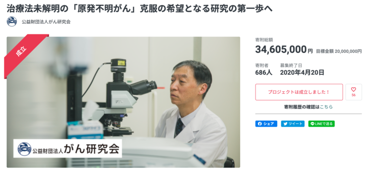 昨日をもちましてがん研究会のクラウドファンディング「治療法未解明の『原発不明がん』克服の希望となる研究の第一歩へ」が無事終了致しました。お陰様をもちまして、当初目標の2000万円は一か月足らずで達成、ネクストゴールの3300万円も最終日当日に無事達成し、最終的には、686名の方より約3460万円のご寄付をいただきました。