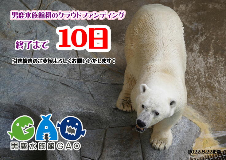 男鹿水族館初のクラウドファンディング、終了まで本日を含めて10日となりました!8/22 14時15分現在で、453名の皆様にご支援いただいております。ありがとうございます。