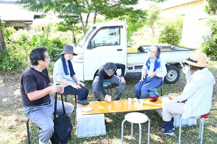 この後、ビニールハウスの横にある立派なケヤキの下で、今後の活動について話し合いました。