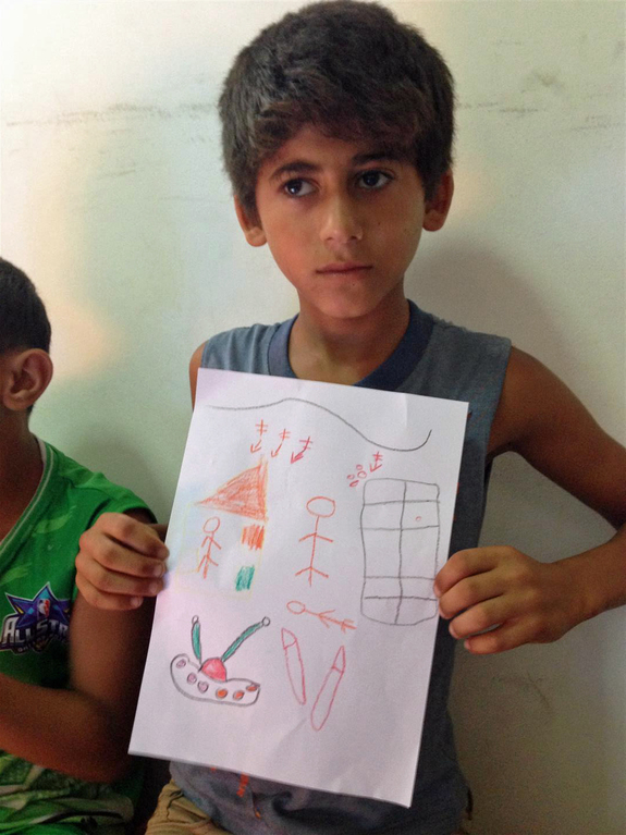 皆さんはこの絵を見て何を感じるでしょうか?モハメド君の家は爆撃により崩壊しました。カウンセリングの中で「逃げる途中、いくつもの死体を見た」と、当時の様子を話したそうです。