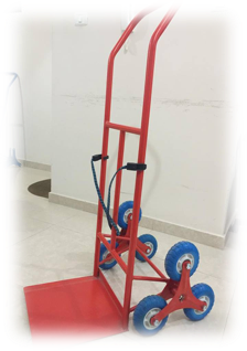 3つのタイヤが三角形状に取りつけられたこのキャリアーは、階段を使った建物内での重い荷物、或いは車椅子などの移送用にデザイン・開発されました。約200キロのものまで対応することができ、“三輪メカニズム”と高トルク電気モーターをうまく利用して移送の負担やリスクを軽減します。