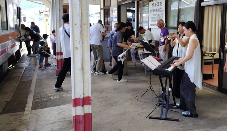芸備線東城駅で7月27日(日)、まちづくりのグループなどが中心となって、臨時列車の運行に合わせて乗客の皆様を歓迎するイベントが行われました。