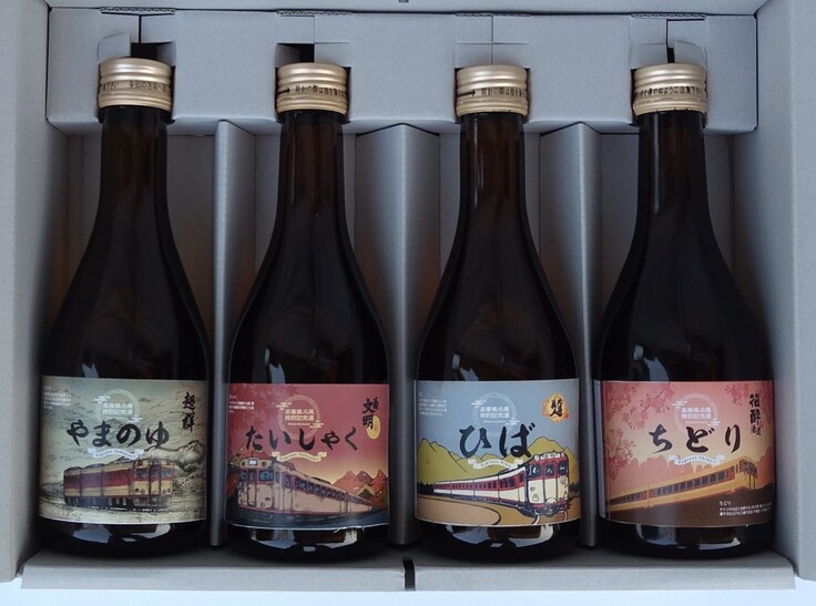 かつての急行を春夏秋冬のイメージにしたデザインのラベルを貼った特別記念酒(純米酒あるいは純米吟醸酒)が2022年に発売されました。芸備線を元気づけようと、広島県庄原市の庄原小売酒販組合が市内の酒造場と協力して企画。当初はそれぞれ720ml瓶だけでしたが、今年から300ml瓶も発売されています。