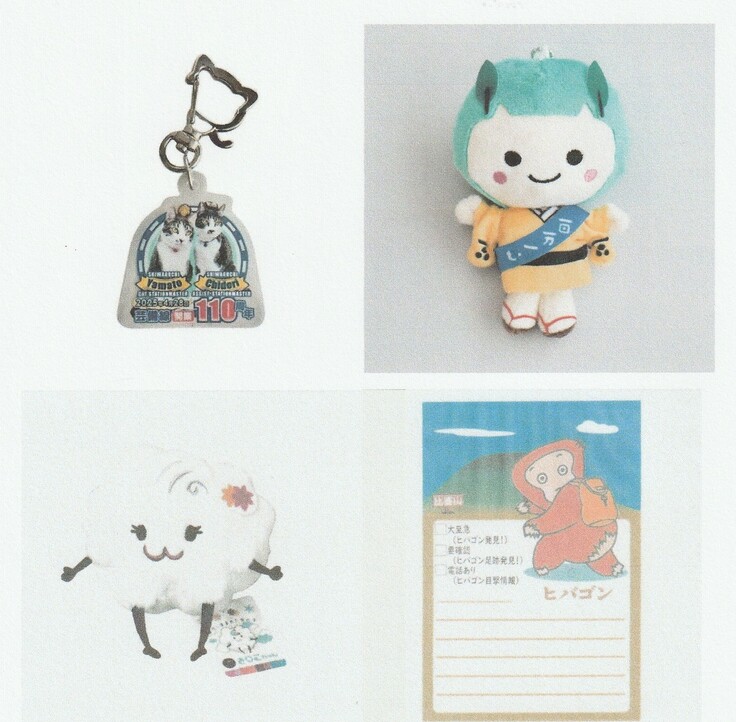 リターン品として用意しているのは、今年開通110周年を迎えた志和口駅のネコ駅長やまと・副駅長ちどりの記念キーホルダー(左上)、安芸高田市のマスコットキャラクター「たかたん」のミニぬいぐるみ(右上)、三次市の観光イメージキャラクター「きりこちゃん」のミニぬいぐるみ(左下)、そして、庄原市西城町で50年前に出没した謎の類人猿「ひばごん」のキャラクターメモ(右下)。