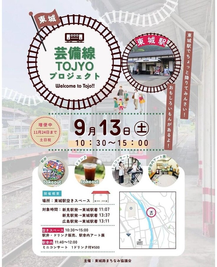 沿線では、実証実験に合わせて、次々とイベントが企画されています。東城駅では13日(土)にも、臨時列車に合わせて、地域の皆さんが駅に出て迎えるイベントがあります。7月から数えて4回目。地元は盛り上がっています。芸備線に乗って、ぜひ、おいでください。