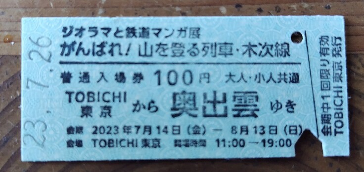 「ジオラマと鉄道マンガ展 がんばれ! 山を登る列車・木次線」は、東京・神田のTOBICHI東京(千代田区神田錦町3-18)で8月13日(日)まで開催中です。関東周辺在住の方、ぜひのぞいてみてください。入場料は100円。硬券を模した入場券を購入し、日付押印器を通し、改札パンチを自ら入れて会場に入ります。
