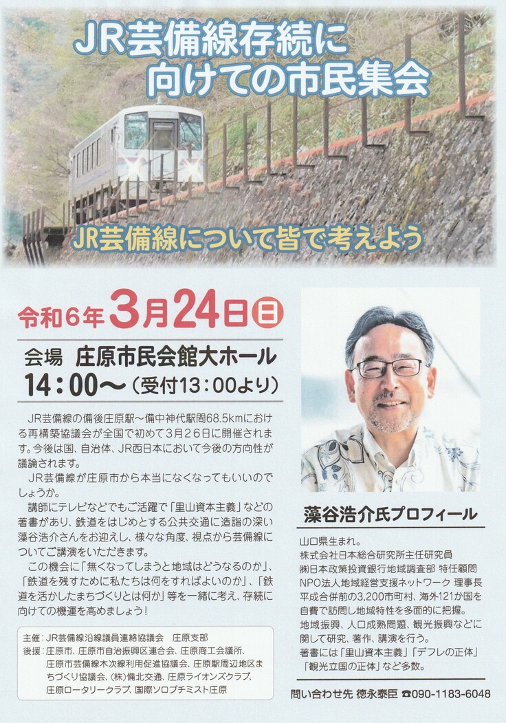庄原市で3月24日、藻谷浩介さんを招き、JR芸備線存続に向けての市民集会が開催されます